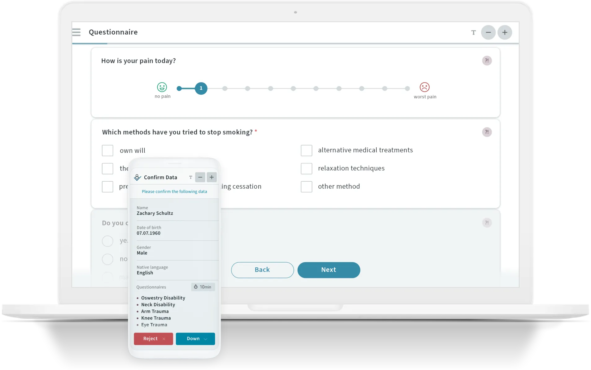 Via software for doctors, medical personnel can assign a specific questionnaire, or a set of questionnaires, to a particular patient. The app then sends a direct link to the questionnaire, or a QR code with the link, to the patient. This link contains basic information about the patient, including the recommended language. When the link is opened, the first screen asks for confirmation of the provided data.